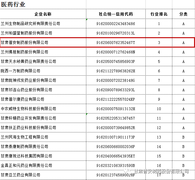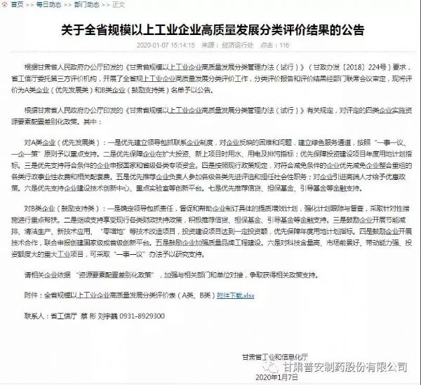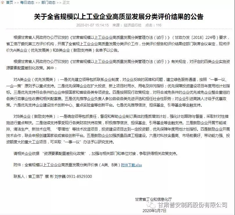 1月7日,根據(jù)甘肅省工業(yè)和信息化廳發(fā)布的“關(guān)于全省規(guī)模以上工業(yè)企業(yè)高質(zhì)量發(fā)展分類評(píng)價(jià)結(jié)果”的公示,普安股份被評(píng)為全省規(guī)模以上工業(yè)企業(yè)高質(zhì)量發(fā)展A類(優(yōu)先發(fā)展類)企業(yè),位列醫(yī)藥行業(yè)前三。此次分類評(píng)價(jià)工作經(jīng)專業(yè)第三方評(píng)價(jià)機(jī)構(gòu)評(píng)審,分類評(píng)價(jià)報(bào)告和評(píng)價(jià)結(jié)果經(jīng)部門聯(lián)席會(huì)議審定,最終確定企業(yè)分類評(píng)價(jià)結(jié)果。普安股份將依據(jù) “資源要素配置差別化政策”對(duì)A類企業(yè)的規(guī)定,加強(qiáng)與相關(guān)部門和單位對(duì)接,爭(zhēng)取獲得相關(guān)政策支持。