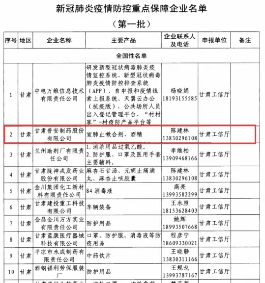 喜訊:甘肅普安制藥股份有限公司榮列國家新冠肺炎疫情防控重點(diǎn)保障企業(yè)名單(第一批)