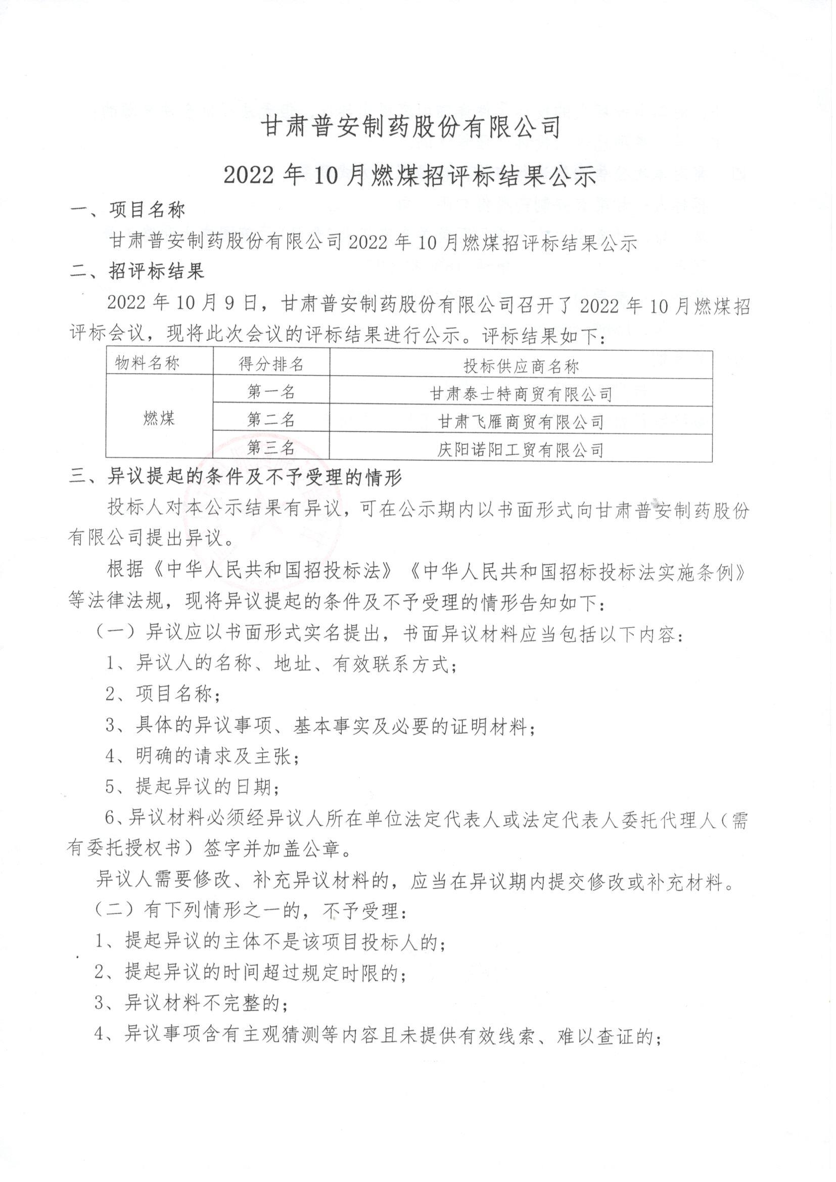 甘肅普安制藥股份有限公司2022年10月燃煤招評(píng)標(biāo)結(jié)果的公示