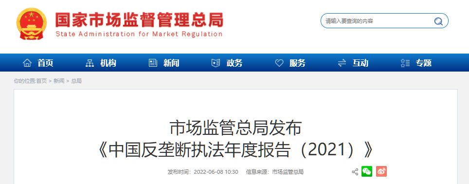 6月8日,國家市場監(jiān)督管理總局發(fā)布《中國反壟斷執(zhí)法年度報告(2021)》,(以下簡稱《報告》)!秷蟾妗分赋,2021年,我國市場公平競爭秩序穩(wěn)步向好,反壟斷和防止資本無序擴(kuò)張取得重要成效。