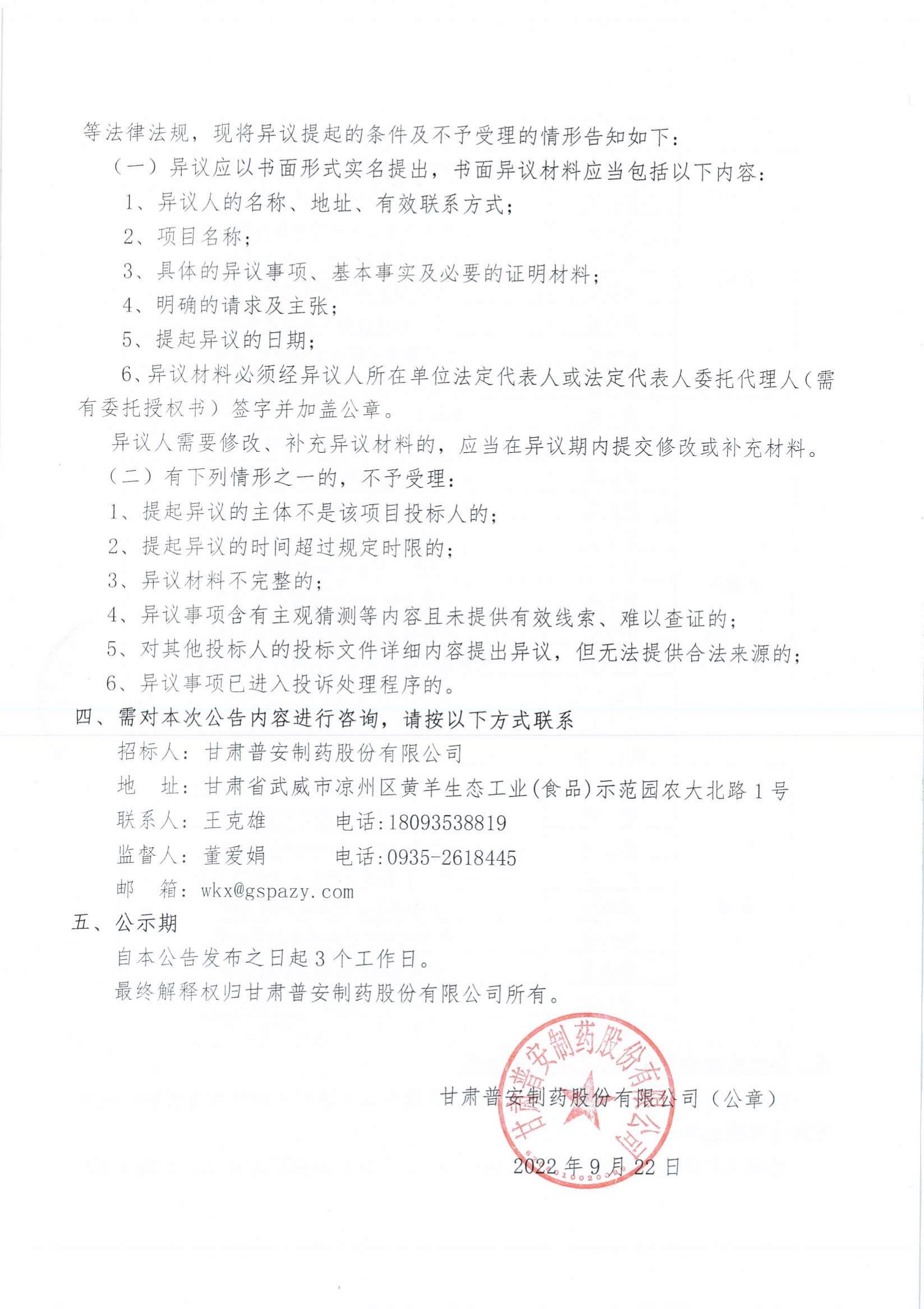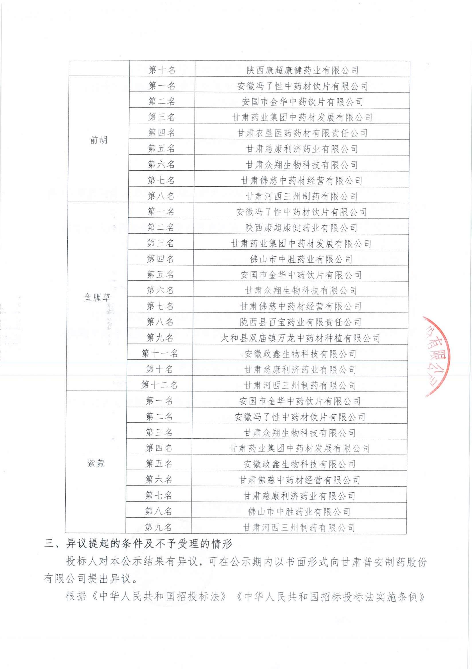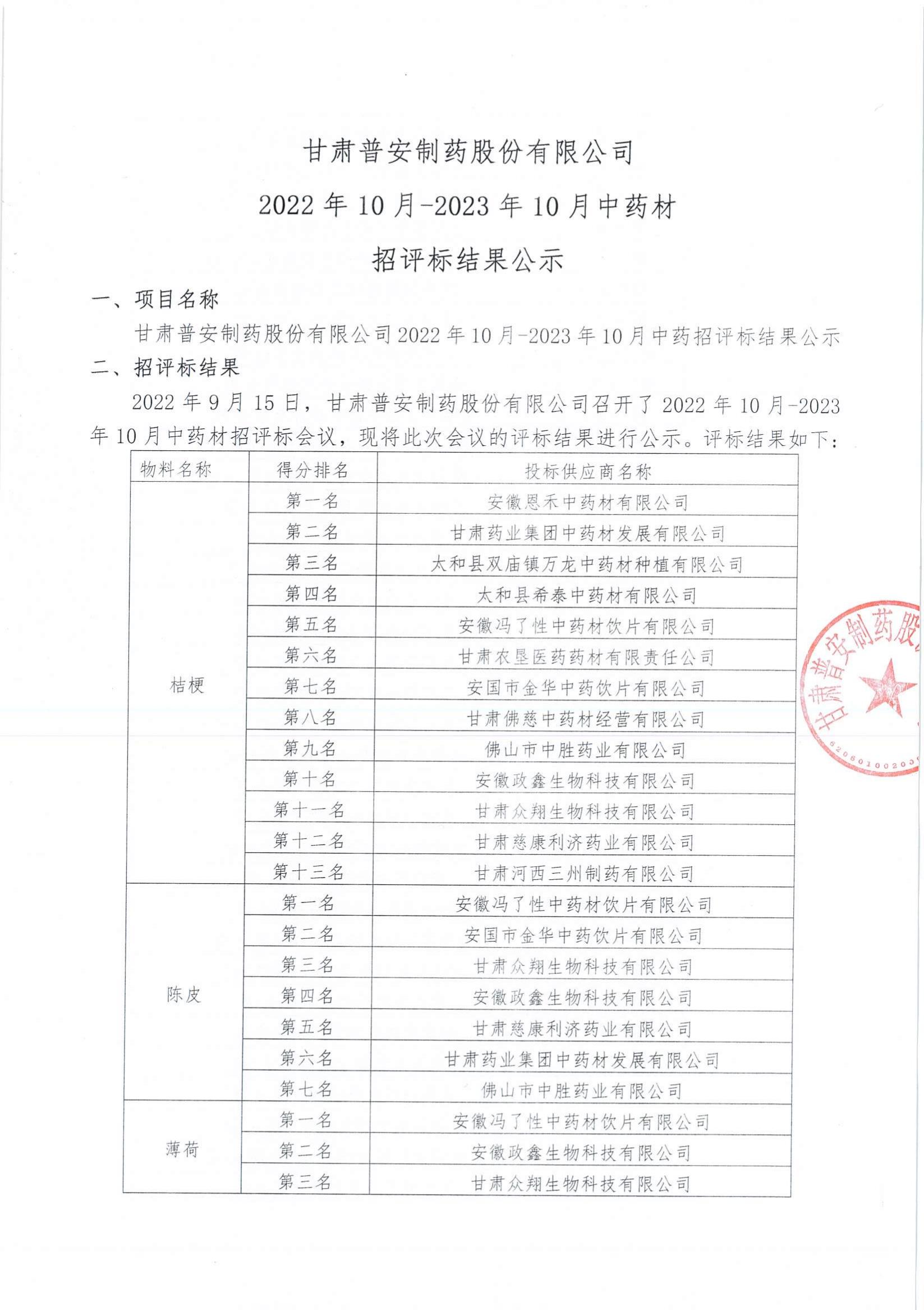 甘肅普安制藥股份有限公司2022年10月-2023年10月中藥材招評(píng)標(biāo)結(jié)果公示