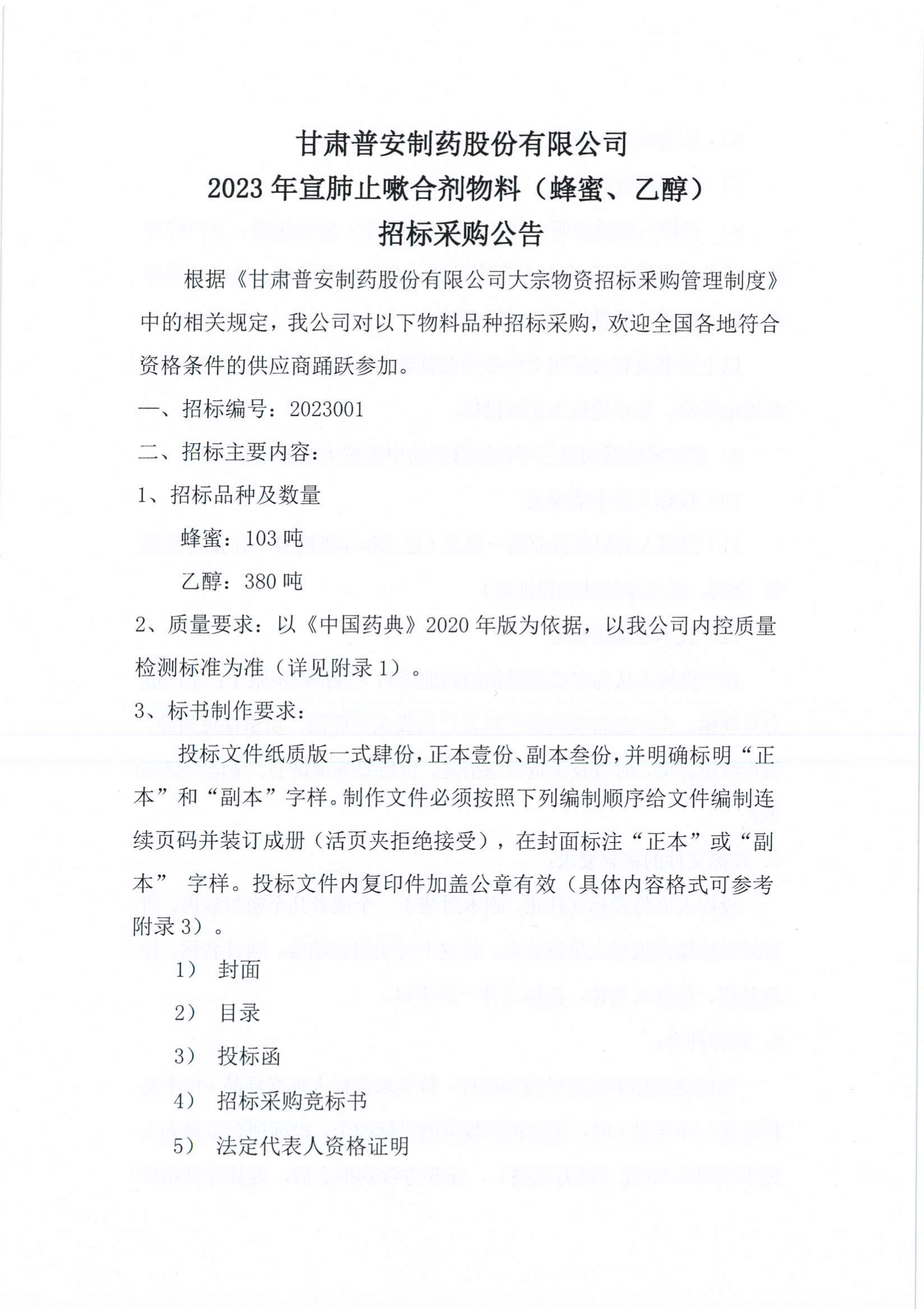 甘肅普安制藥股份有限公司2023年宣肺止嗽合劑物料(蜂蜜、乙醇)招標(biāo)采購公告