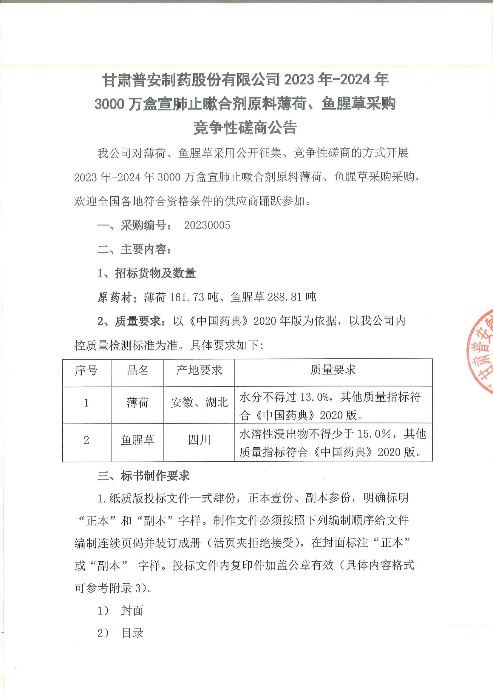 甘肅普安制藥股份有限公司2023年—2024年3000萬盒宣肺止嗽合劑原料薄荷、魚腥草采購競爭性磋商公告