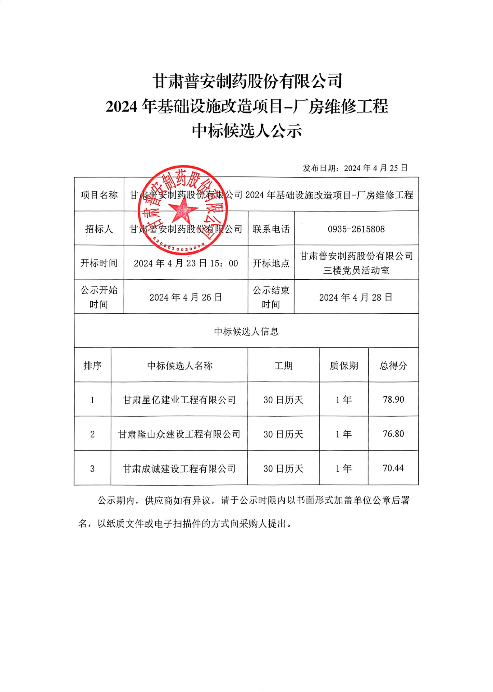 甘肅普安制藥股份有限公司2024年基礎(chǔ)設(shè)施改造項(xiàng)目-廠房維修工程中標(biāo)候選人公示