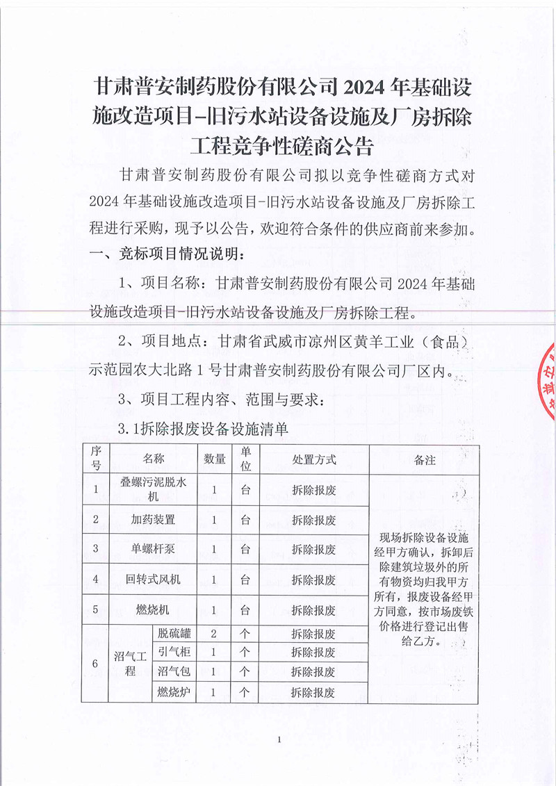 甘肅普安制藥股份有限公司2024年基礎(chǔ)設(shè)施改造項(xiàng)目-舊污水站設(shè)備設(shè)施及廠房拆除工程競(jìng)爭(zhēng)性磋商公告