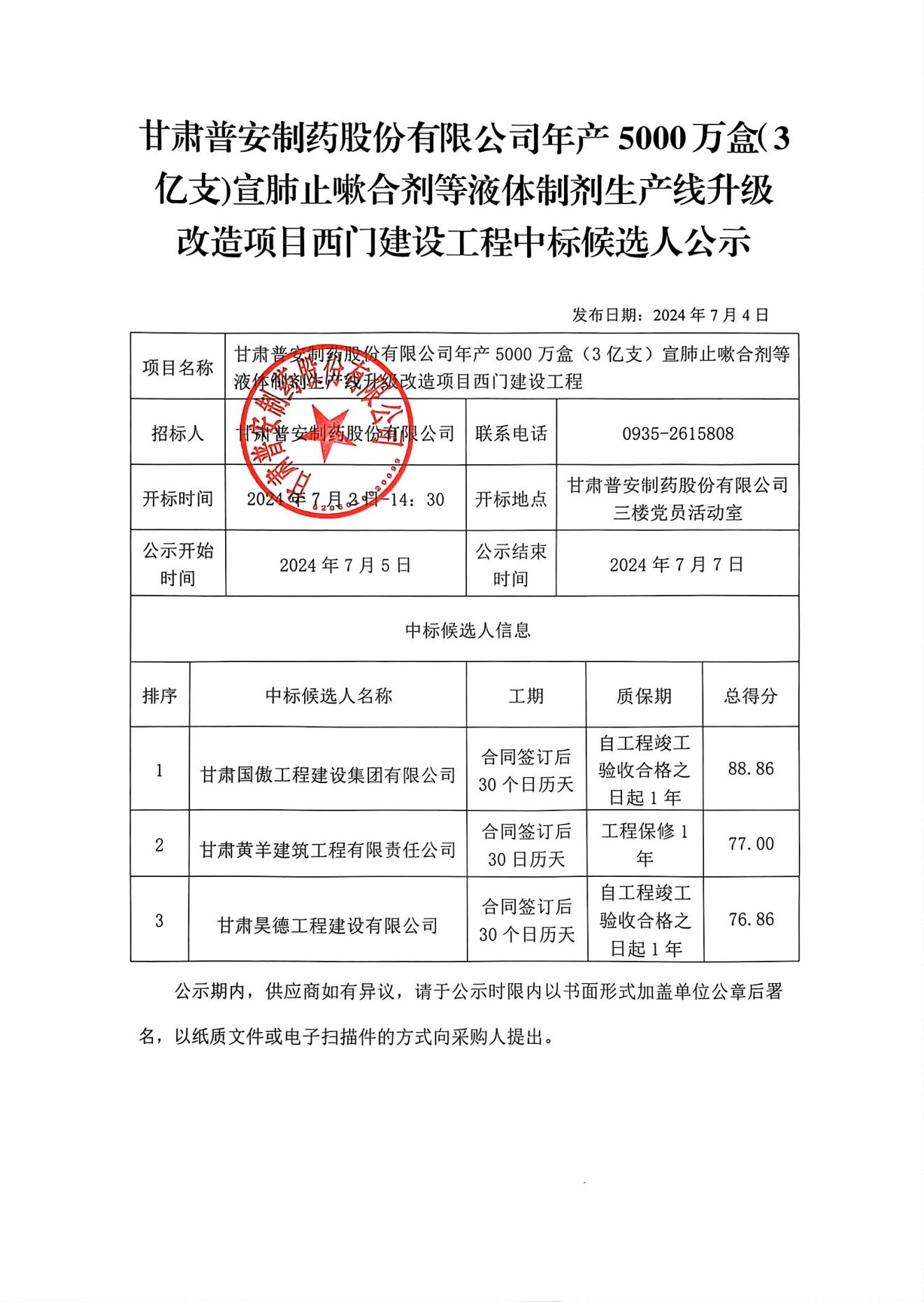 甘肅普安制藥股份有限公司年產(chǎn)5000萬盒(3億支)宣肺止嗽合劑等液體制劑生產(chǎn)線升級改造項(xiàng)目西門建設(shè)工程中標(biāo)候選人公示