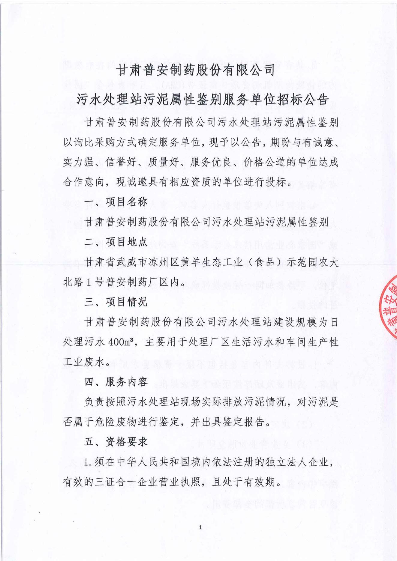 甘肅普安制藥股份有限公司污水處理站污泥屬性鑒別服務單位招標公告