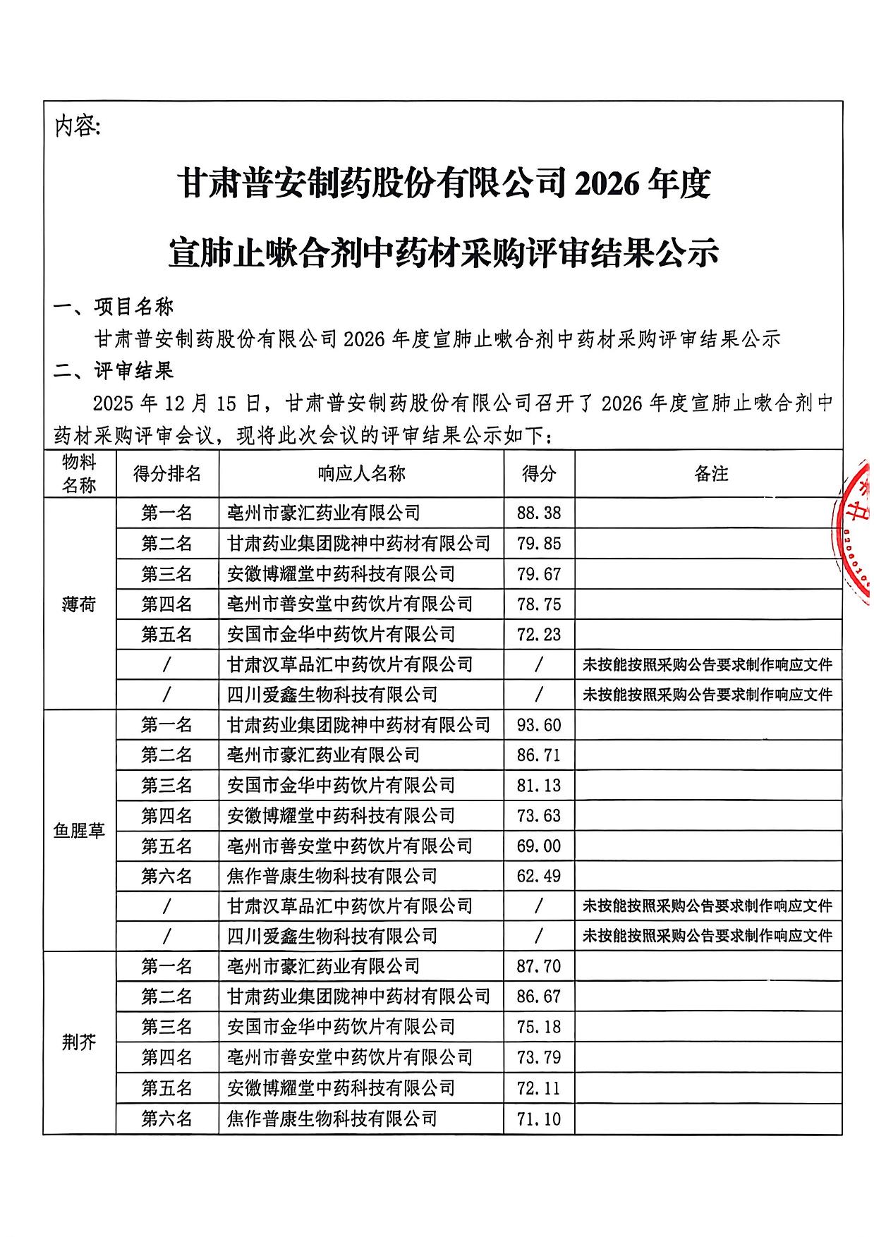 甘肅普安制藥股份有限公司2026年度宣肺止嗽合劑中藥材采購評審結(jié)果公示
