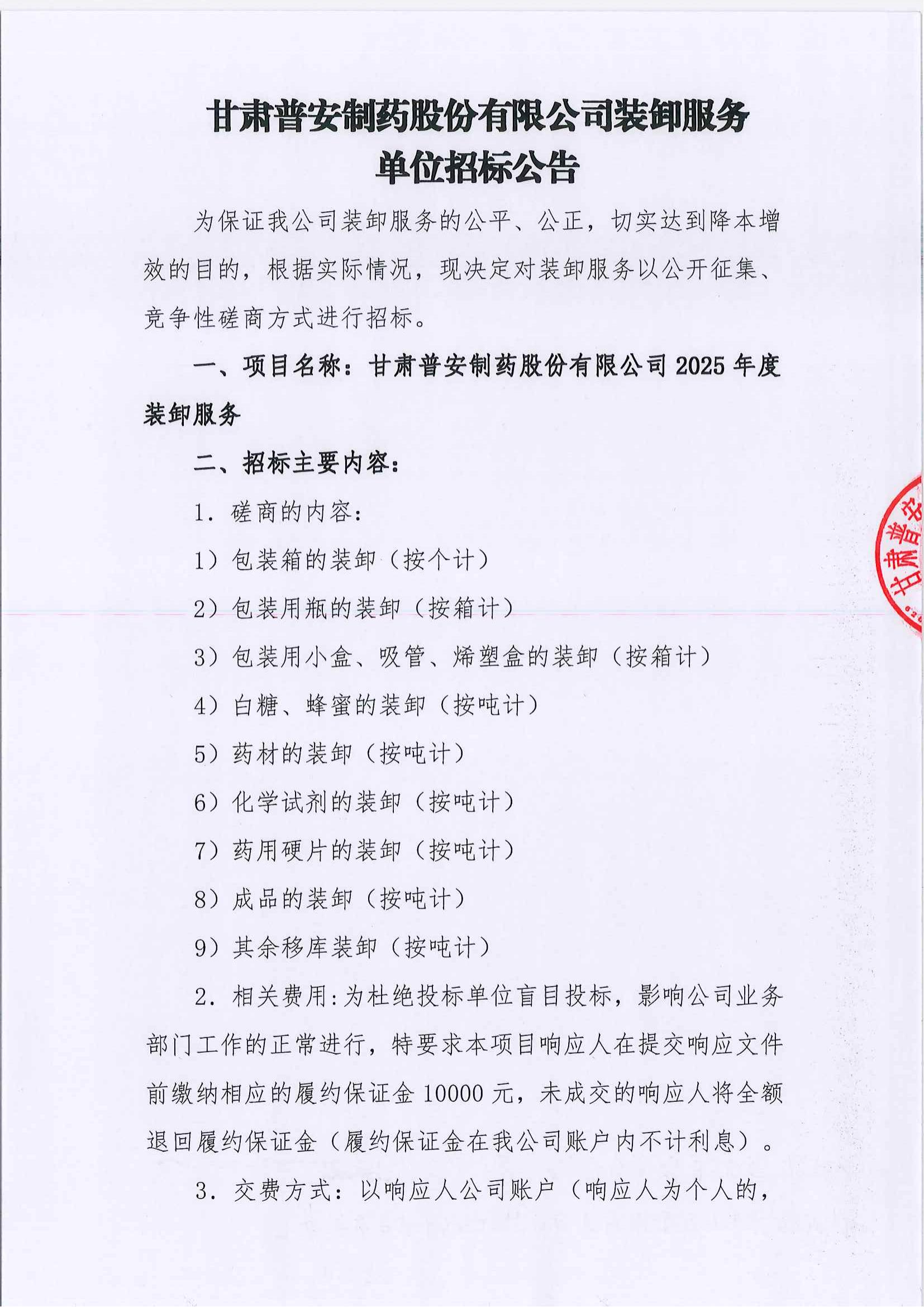 甘肅普安制藥股份有限公司裝卸服務(wù)單位招標(biāo)公告