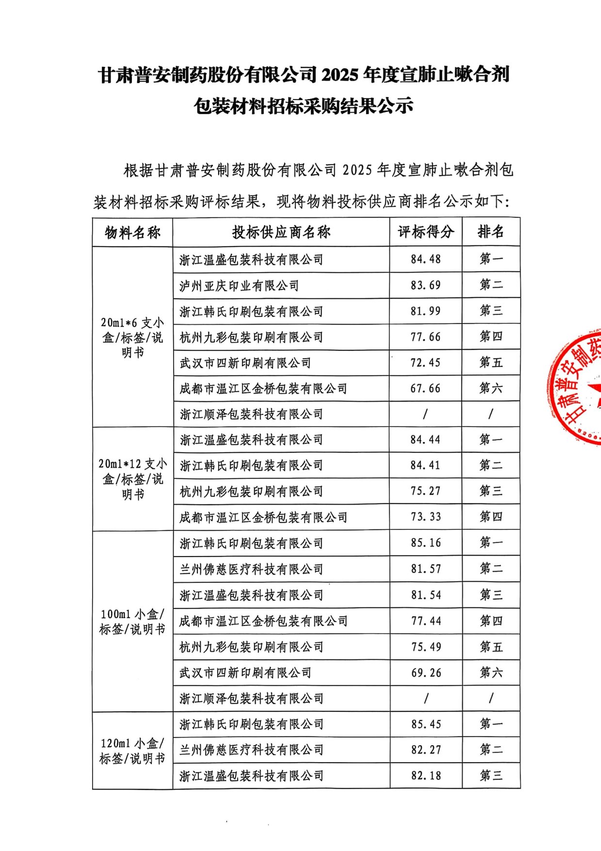 甘肅普安制藥股份有限公司2025年宣肺止嗽合劑包裝材料招標(biāo)采購(gòu)結(jié)果公示