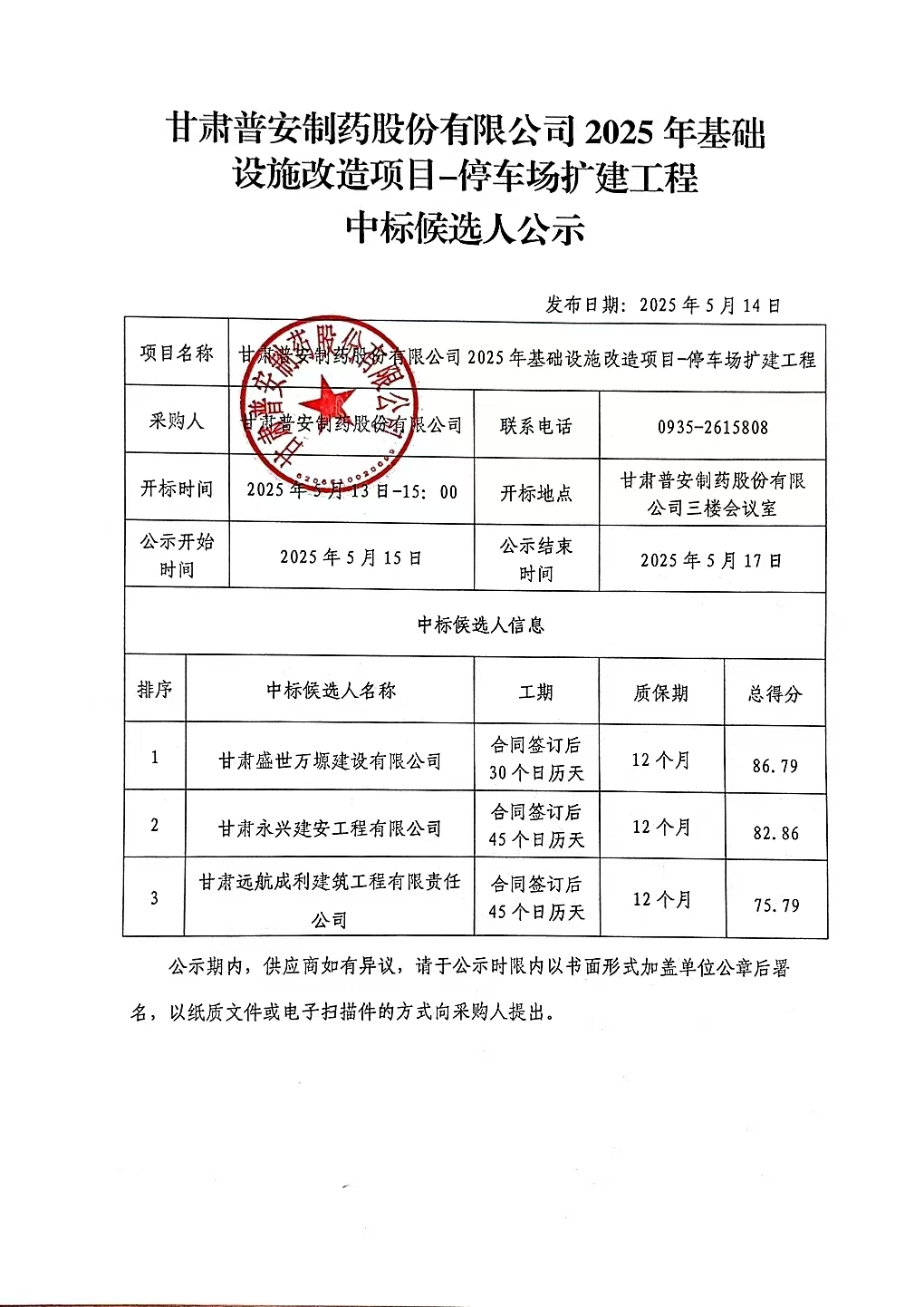 甘肅普安制藥股份有限公司2025年基礎(chǔ)設(shè)施改造項(xiàng)目——停車場(chǎng)擴(kuò)建工程中標(biāo)候選人公示