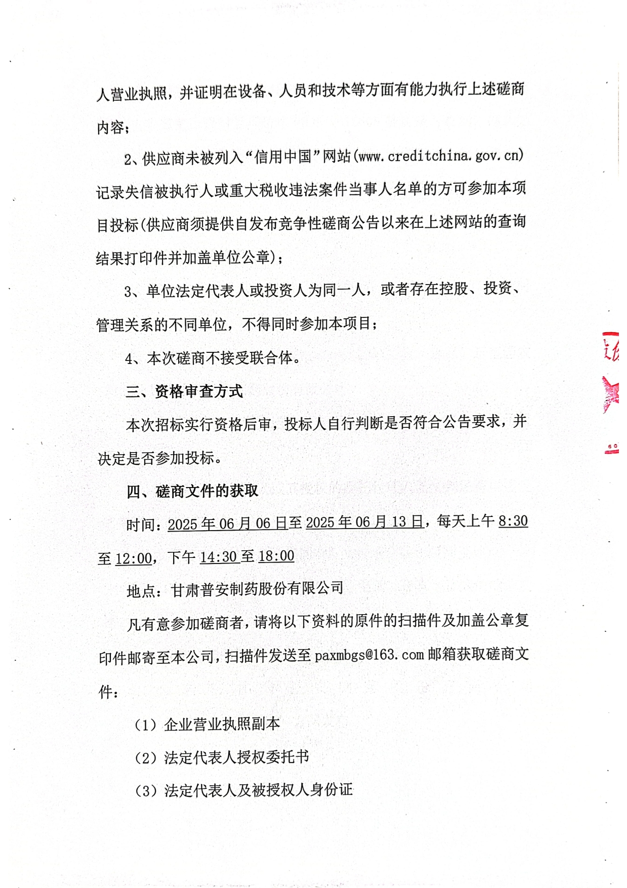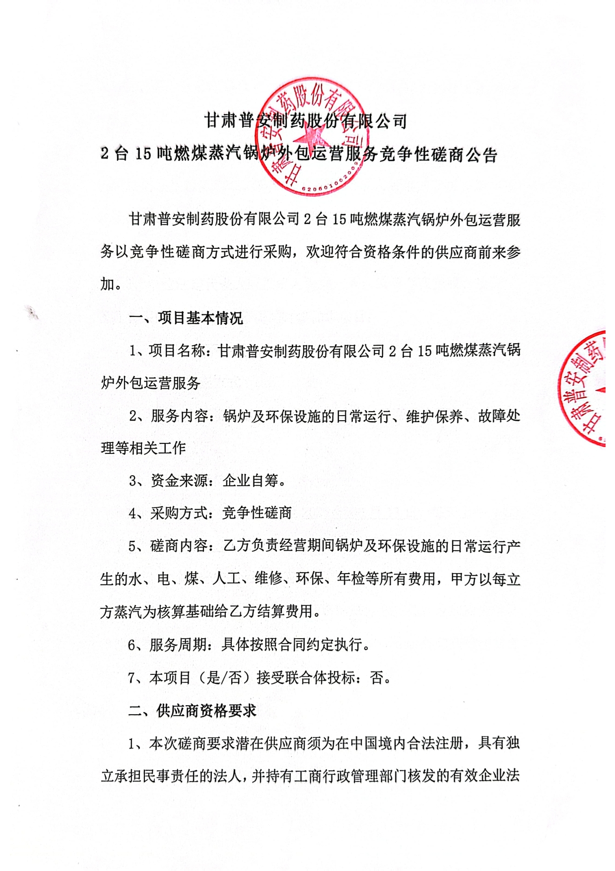 甘肅普安制藥股份有限公司2臺(tái)15噸燃煤蒸汽鍋爐外包運(yùn)營(yíng)服務(wù)競(jìng)爭(zhēng)性磋商公告