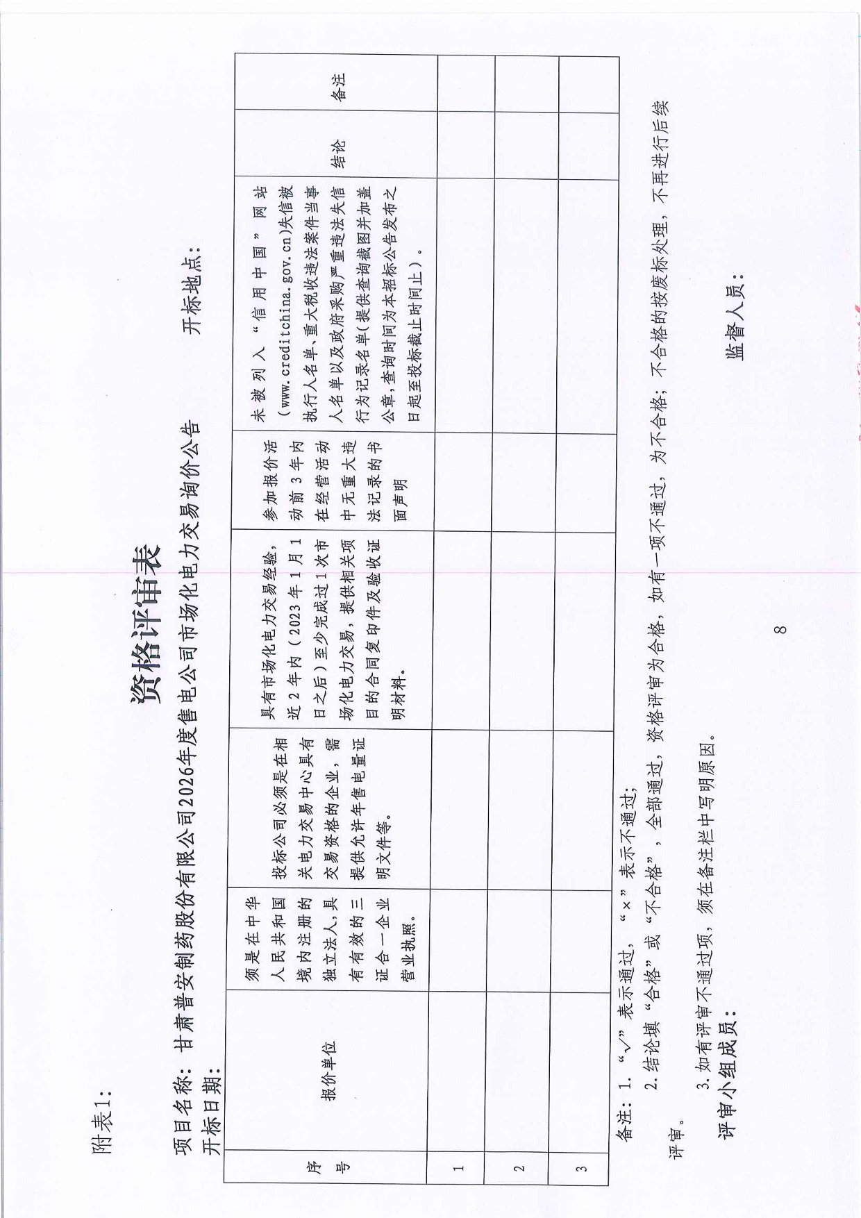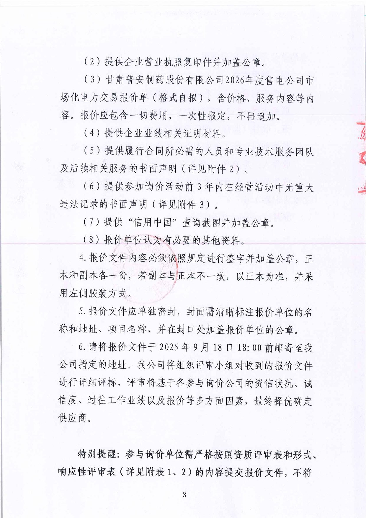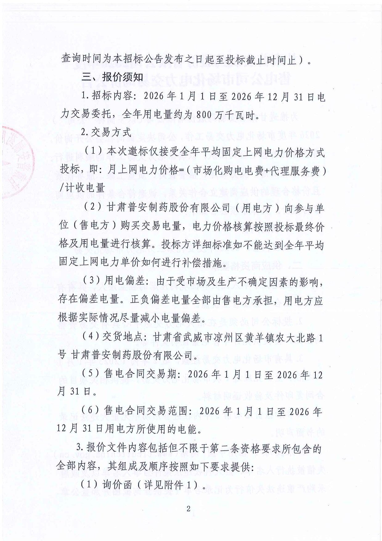 甘肅普安制藥股份有限公司2026年度售電公司市場(chǎng)化電力交易詢價(jià)公告