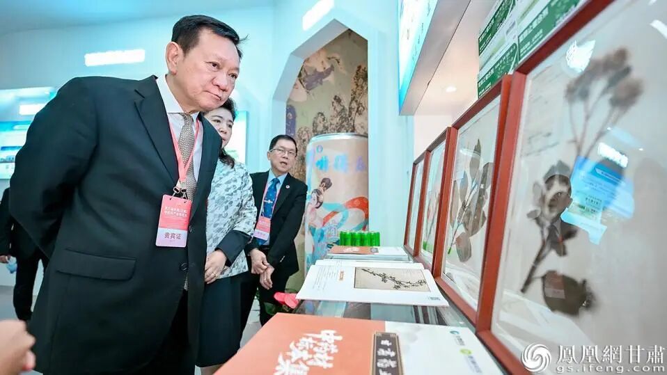 泰國(guó)公共衛(wèi)生部部長(zhǎng)顧問(wèn)科希特•蘇維尼吉(左一)走進(jìn)甘肅藥業(yè)集團(tuán)展館,了解中藥材標(biāo)準(zhǔn)化種植基地建設(shè)情況。李德宇 攝