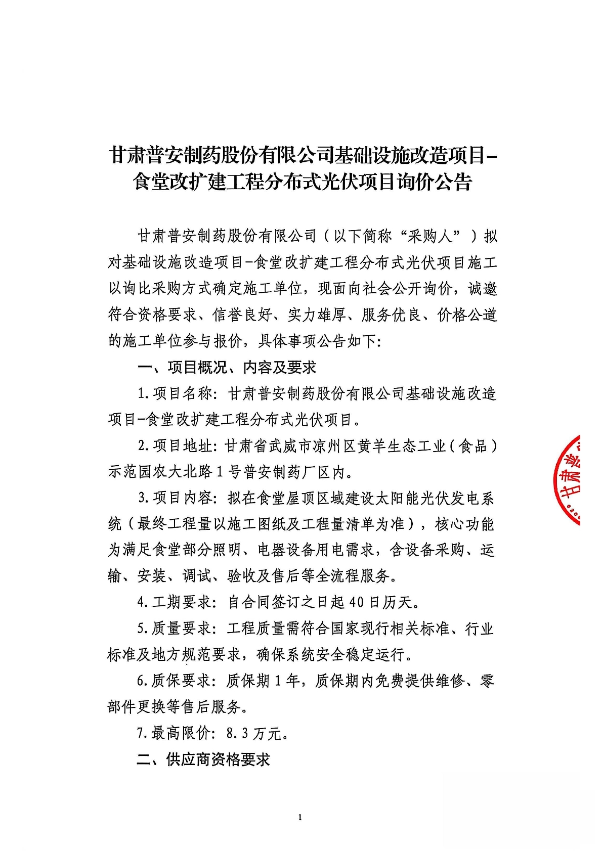 甘肅普安制藥股份有限公司基礎(chǔ)設(shè)施改造項目-食堂改擴建工程分布式光伏項目詢價公告